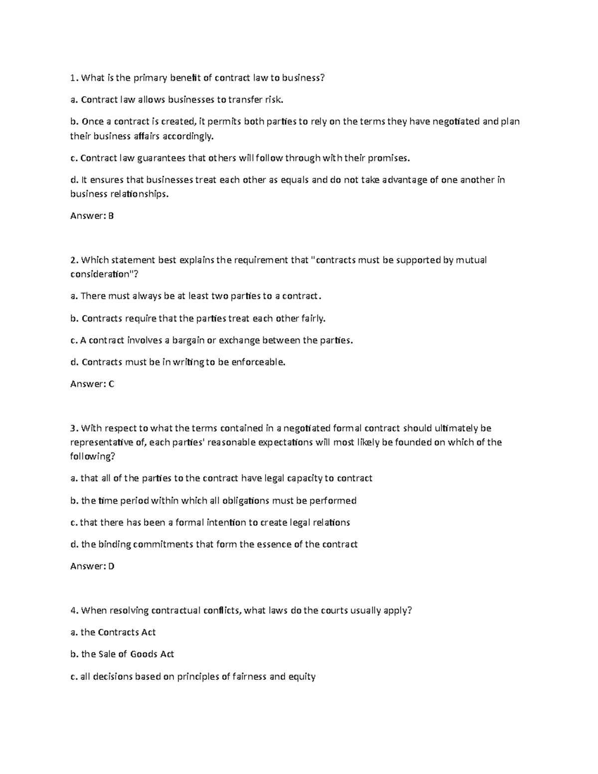 Busn331 Final Exam 1 What Is The Primary Benefit Of Contract Law To Business A Contract Law Studocu